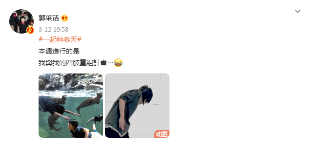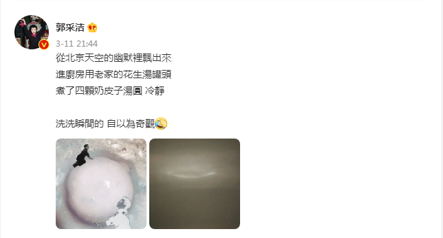 近期,郭采洁也多次在社交媒体上用各种形式的抠图分享自己的日常,让看似平平无奇的生活琐事变得十分有趣。春日四肢重组计划中将努力舒展的自己贴入水域之中;一颗奶皮子汤圆也在她的奇思妙想下变得如同一个载满生命的星球。一直以来,郭采洁在社交媒体上的配图都极具郭式风格,被网友笑称是“最会抠图的女艺人”。不禁让人期待,她下一次的更新又会是怎样让人脑洞大开的内容。